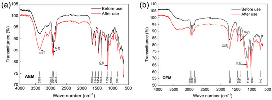 The FT-IR spectra of IEMs before and after 5 months of usage were tested in the range of 500–4000 cm−1. From Figure 7a, the stretching vibrational absorption peaks at 3363 cm−1 and 1159 cm−1 belong to N-H and -C-N- groups, respectively. A distinct absorption peak at 1149 cm−1 is observed in Figure 7b, which may be derived from the -S-O- vibration of the sulfonic acid group. In Figure 7, no significant new peaks appeared in the FT-IR spectra of IEMs after use, compared to the fresh membranes. Overall, the IEMs maintained a good stability in the process of ED desalination of RSW.