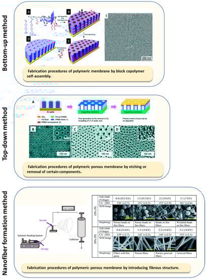 Examples of porous polymer membrane fabrication techniques [23], showing porosity created by bottom-up methods, such as polymer assembly (adapted with permission from [24], Copyright 2010, American Chemical Society, and from [25], Copyright 2014 John Wiley and Sons.), by top-down methods such as etching or dissolving certain components (adapted with permission from [26], Copyright 2010, American Chemical Society), and by assembling fine fiber structures, such as by electrospinning (adapted from [27], which has an open-access CC BY-NC 3.0 license).
