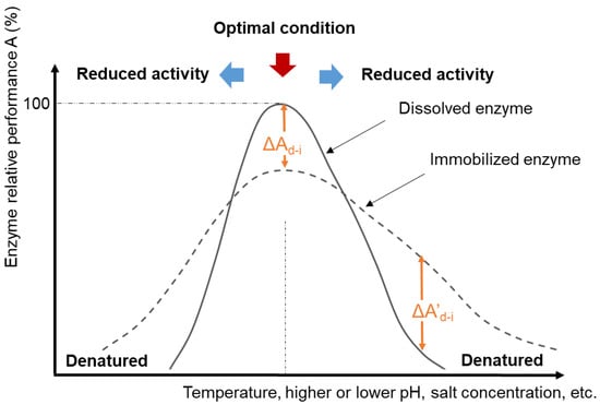 Enzymes exhibit the fastest catalytic effects at certain “optimal” conditions of temperature, pH, ionic strength, and other factors (Figure 3). These conditions vary for specific isozymes and between enzyme classes. The optimal pH may be associated with the ionization state of functional groups within the active site when this is important for the catalytic mechanism. The optimal temperature often corresponds to the temperature just below the enzyme denaturation temperature because reaction rates generally increase as temperature increases. When enzymes denature, the protein structure unfolds to an extent that the three-dimensional orientation of the active site is disrupted, leading to a loss of catalytic activity. The optimal activity conditions may or may not correspond to the conditions at which the enzyme structure is most stable [44]. For example, a partially denatured (unfolded) enzyme might exhibit higher than usual catalytic activity (provided that the active site is still intact) because the active site may be more exposed to its substrate [45] and (especially if a higher temperature is a factor in the partial unfolding) the reaction kinetics will be faster [46]. Outside of the optimal activity zone, enzymes may still catalyze the reaction, but at reduced rates. Compared to dissolved enzymes, research shows that immobilized enzymes often demonstrate a higher tolerance toward more extreme process conditions [1,2,4,47,48,49] (dashed line in Figure 3). However, there can be trade-offs between enzyme stability (extended activity even under stressed conditions) and enzyme catalytic activity (the rate at which substrates are converted to products), which must be taken into consideration when comparing their overall catalytic efficiencies [44].