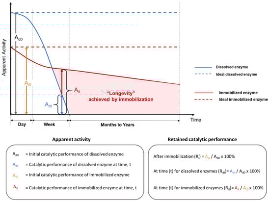 Although a drop in the instantaneous enzyme performance between dissolved (Ad0 in Figure 4) and immobilized enzymes with physical support (Ai0 in Figure 4) is often observed at optimal reaction conditions for the soluble enzyme, the true benefit of using an immobilized enzyme emerges when the real application exposes the unprotected soluble enzymes to intolerable conditions, but spares the protected immobilized enzymes. A comparison of enzyme longevity for dissolved (Ad0 and Adt) and immobilized (Ai0 and Ait) enzymes in terms of the apparent enzyme activity versus time is illustrated in Figure 4. Adt and Ait are the catalytic performance of dissolved and immobilized enzymes at time t, respectively. The depicted rapid activity loss of soluble enzyme is often observed experimentally, either due to enzyme denaturation or to the difficulties of recovering and reusing dissolved enzyme proteins. This type of significant performance drop is indicated by a low Adt over short periods (hours to days) in real applications (solid blue line in Figure 4), if no supplemental enzymes are added [68]. In comparison, the retained activity of enzymes that are bound to a physical support over very long time periods (months to years) is a hallmark of the improved enzyme longevity that can be obtained via immobilization (shaded area in Figure 4).