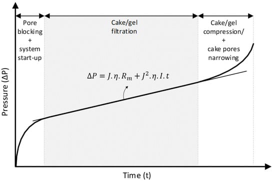 The MFI-UF is based on a cake/gel filtration mechanism []. At a constant flux, cake/gel filtration can be defined by the linear correlation of the transmembrane pressure () and the filtration time (), as shown in Equation (1).
