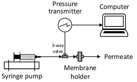 MFI-UF measurements were performed using the set-up schemed in Figure 2. The set-up simply consisted of three main items: an infusion syringe pump, pressure transmitter, and membrane holder (including the UF membrane). During the test, the water sample was delivered at a constant flow rate to the UF membrane. Simultaneously, the pressure transmitter recorded the transmembrane pressure () over time (t) and transferred the data to a connected computer. Finally, the relationship between the and was plotted (as shown in Figure 1), and then the MFI-UF value was calculated based on Equations (4) and (5).