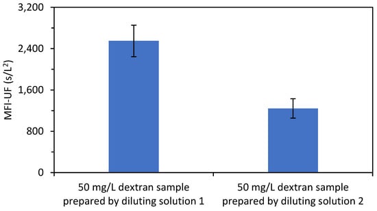 The reason that the MFI-UF calibration line was not reproducible with the dextran solutions was assumed to be attributed to the diluting buffer solution (potassium phosphate buffer solution) used to prepare the dextran samples. To confirm this, the MFI-UF was measured using samples of dextran (50 mg/L) prepared with two diluting buffer solutions which were prepared based on the same procedure explained in Section 3.3. As shown in Figure 4, the variation in the MFI-UF of the dextran samples prepared with the same diluting solution was 12–15% (with the MFI-UF measurements performed in triplicate for each diluting solution). However, the variation in the average MFI-UF of the dextran samples prepared with different diluting solutions was more than 100%.