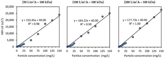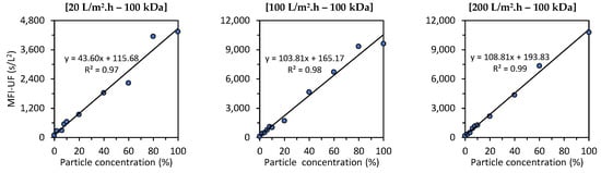 Figure 7 shows the relationship between the MFI-UF and the particle concentration in canal water (CW) under different testing conditions (at flux rates of 20, 100, and 200 L/m2·h using 5, 10, and 100 kDa membranes). As explained in Section 3.4, the raw CW used to prepare the CW dilutions was different for each testing condition, since the raw CW was collected at different times of the year. This means that the water quality for each testing condition was different (turbidity = 1.5–3.0 NTU, TOC = 11–18 mg/L, and EC = 600–800 uS/cm). Therefore, the effect of the flux and membrane MWCO on the MFI-UF values (and thus on the slopes of linear relationships) in Figure 7 cannot be compared. For instance, for the 10 kDa membranes, the MFI-UF values measured at 20 L/m2·h were close to the corresponding MFI-UF values measured at a higher flux of 100 L/m2·h. This is because the quality of raw CW used at 20 L/m2·h was lower than that at 100 L/m2·h (e.g., the TOC was 16 and 11.2 mg/L for the raw CW used at 20 and 100 L/m2·h, respectively).