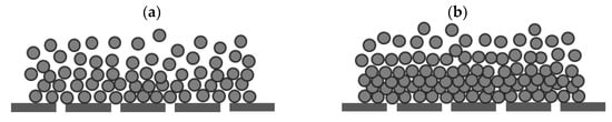 Hypothesized illustration of the cake formed by polystyrene particles in case of a (a) lower particle concentration and (b) higher particle concentration.