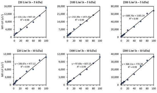 Based on Figure 7, the MFI-UF linearity range was verified up to around 70,000 s/L2 (at 200 L/m2·h using a 5 kDa membrane). However, it is expected that the MFI-UF linearity could be extended to higher levels of MFI-UF in cases where other types of water (with higher particle concentrations) are used. Nevertheless, the observed linearity ranges (Figure 7) were confirmed to cover the MFI-UF levels among different RO plants measured in previous works [,].