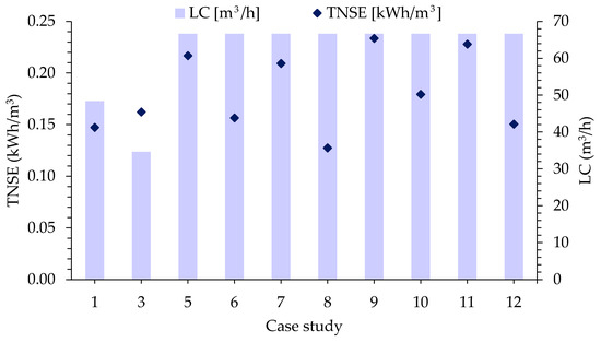 Treated water flow per branch of RED units and specific energy produced for each respective case. LC: low-concentrated stream (treated wastewater flow rate) and TNSE: Total Net Specific Energy measured in kWh/m3 of LC entering RED stack. WWTP of Comillas: S1—cases 1 and 3 and WWTP of Ierapetra: S2—cases 5–12.