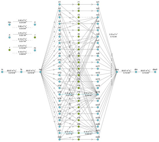 Optimized hydraulic configuration of the HC stream for a modular branch consisting of 22 RUs in S2—case 8. Legend: x = RED unit number; r(x) = RED module x; ri(x) = HC input flow to module x; ro(x) = HC output flow to module x; rsu = splitter unit; rmu = mixer unit; fs = in = HC feed stream; dm = disch = HC discharge.