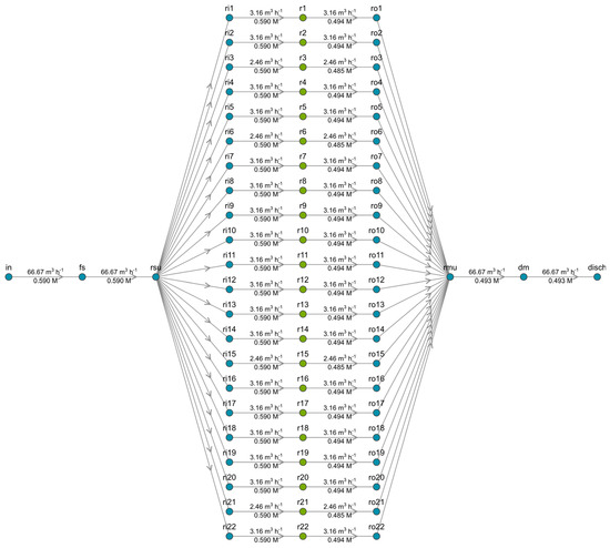Optimized hydraulic configuration of the LC stream for a modular branch consisting of 22 RUs in S2—case 8. Legend: x = RED unit number; r(x) = RED module x; ri(x) = LC input flow to module x; ro(x) = LC output flow to module x; rsu = splitter unit; rmu = mixer unit; fs = in = LC feed stream; dm = disch = LC discharge.