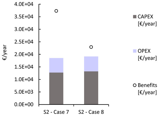 Looking at the cost–benefit ratio over the entire lifetime of the plant monetized to date, it is apparent that the technology is cost-effective in all cases analyzed in site S2 for the specified operating conditions. In S1 the implementation of the SGE-RED technology at current membrane price conditions, around 10 EUR/m2, would not even meet the return on investment (break-even point). In this regard, the optimization simulations have determined that the extraction of SGE using RED under up-to-date conditions of development and commercialization of RED equipment (S1—case 2 and S1—case 4) is unfeasible, due to the non-profitability of the project at this site in both the winter and summer seasons. The results obtained in S1 reaffirm that the technical feasibility is strongly conditioned by the operating conditions. Nonetheless, S1 has a preliminary foresight of positive profitability.