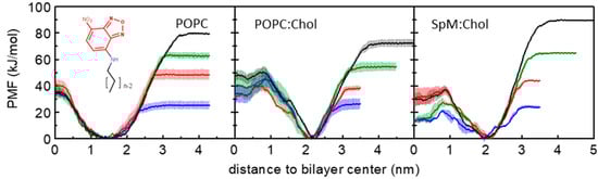 The PMF profiles allow the calculation of free energy differences (ΔG) between distinct positions along a reaction coordinate. The PMF profiles for the symmetric bilayers are summarized in Figure 1, showing in separate plots the PMF of all amphiphiles for each studied bilayer. For better comparison of the data, the reference values of the PMF profiles were defined at the equilibrium position (minimum energy location in the reaction coordinate). As expected from the similarities between the amphiphiles (that have the same polar fluorophore), and in accordance with our previous unrestrained MD simulations for this homologous series in POPC membranes [57] and in cholesterol-containing membranes [59], all PMF profiles have a minimum value when the NBD is located near the head group region. For distances closer to the bilayer center, the PMF profile raises due to the presence of the translocation barrier, while for distances closer to water it raises due to the transfer of the amphiphile to the water which is a poor solvent for these molecules. As shown in equilibrium unrestrained simulations, the minimum in the free energy path is located at a higher distance from the center of the bilayer for the cholesterol-containing membranes. This is not only because of the higher membrane thickness but also because the equilibrium position of the NBD group is indeed in a more external position in the membranes with cholesterol [59]. This more external position of the NBD group in the cholesterol-containing membranes may be related to a larger lateral pressure at the membrane/water interface and with the alignment of the NBD dipole moment with the larger dipole potential in the POPC:Chol membranes [80]. The larger dipole potential of the cholesterol-enriched membranes increases the relative contribution of the interaction between the dipoles and leads to the displacement of the NBD group towards a more external position in the membrane where the interaction between the dipoles becomes attractive. An interesting feature of the PMF profiles in the membranes with cholesterol is the existence of a local minimum at the center of the bilayer. Although the presence of the local minimum was at first quite unexpected, it is indeed present in the PMF profiles of several solutes in cholesterol-containing membranes [27,81,82]. Moreover, it has been shown experimentally that cholesterol accumulates in the middle of 1,2-diarachidoyl-sn-glycero-3-phosphocholine (DAPC) bilayers with high cholesterol fractions [83,84]. However, we should note the considerable difference between the lipid bilayers used in this study compared to DAPC and the different structures of the NBD-Cn amphiphiles and cholesterol. The existence of a local minimum at the bilayer midplane may be justified by the low density in that region of the membrane, which in the cholesterol-containing membranes has an accentuated decrease compared to pure phospholipid bilayers [57,59].