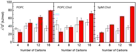 Figure 2 shows the energy barriers for the processes of desorption and translocation of each amphiphile in each symmetrical bilayer. The energy barrier for the desorption increases linearly with the number of carbons as expected for interactions dominated by the hydrophobic effect. On the other hand, there is no clear tendency regarding the dependence of the translocation energy barrier on the number of carbons, both for pure POPC and cholesterol-containing bilayers. Variations in the height of the energy barriers at the bilayer center along the homologous series seem to be caused by possible sampling issues in the cholesterol-containing systems. The dependence of energy barriers, for both desorption and translocation processes, on the number of carbons of the amphiphile alkyl chain is in agreement with experimental results for the transfer of labeled phospholipids between vesicles [5,85], and with the kinetics of interaction of these amphiphiles with POPC bilayers [7]. For long-chain amphiphiles NBD-C12 and NBD-C16, the energy barrier for desorption is higher than that for translocation. In opposition, for NBD-C4 the energy barrier for translocation is higher than for desorption, except in the SpM:Chol bilayer. For phospholipids and long-chain amphiphiles that fit the full length of the lipid monolayer, the height of the energy barrier for translocation is expected to be directly related to the energy required to place the polar groups in the nonpolar center of the bilayer. Therefore, in homologous series where the polar part of the molecule is maintained, one would expect that the energy barrier for translocation is not strongly dependent on the nonpolar part of the molecule. This is in fact observed for this homologous series in the POPC and POPC:Chol membranes (Figure 2, left and middle panels), and observed experimentally for POPC membranes [7]. However, for very ordered membranes, the presence of solute molecules that do not fit the length of the lipid monolayer will cause membrane perturbations that may contribute to a faster translocation process [86,87]. This could be the reason for the significantly lower energy barrier observed for NBD-C4 in SpM:Chol membranes (Figure 2, right panel).