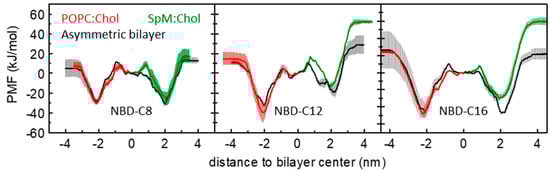 We addressed the effect of asymmetry of lipid bilayers in the interaction with the amphiphilic molecules. Figure 3 compares the calculated PMF profiles for these amphiphiles in symmetrical and asymmetrical systems. This representation assumes the reference of the PMF in the bilayer center, for better comparison between the profiles in the symmetric systems with the transmembrane profile obtained for the asymmetric system. The PMF obtained in the POPC:Chol leaflet of the asymmetric membrane is very similar to that obtained in the symmetric membrane (PMFs in red and black respectively). However, for SpM:Chol membranes, although the profiles are not qualitatively dissimilar, the free energy barrier for desorption from the SpM:Chol side in the asymmetrical bilayers seems consistently lower than that determined in the corresponding symmetrical SpM:Chol systems, especially for the longer-chained NBD-C12 and NBD-C16 amphiphiles. For the latter two molecules, the free energy profiles from the center to water through the two different leaflets in the asymmetric membrane are considerably more similar than could be anticipated from the curves obtained in the symmetric systems. This suggests that the presence of the less ordered POPC:Chol leaflet influences the properties of a SpM:Chol leaflet, reflecting some degree of coupling between the two leaflets [91,92,93,94,95]. However, the effects are relatively small, and the high rugosity observed in the PMFs obtained in the asymmetric bilayer suggests that the differences may also reflect sampling issues. As described in [58], sampling problems can preclude a rigorous quantitative evaluation of the results, and their qualitative interpretation is much more straightforward. Considering methodological developments on [58], here all results are given by simulations using the PGC (pull geometry cylinder) scheme, as described in Section 2.2.1. The convergence of the free energy barriers for all amphiphiles, in POPC:Chol (1:1), SpM:Chol (6:4) and POPC:Chol (1:1)/SpM:Chol (6:4) is shown in Supplementary Materials, Figures S3–S5. From the above, in the following, we will focus on the symmetric lipid bilayers.