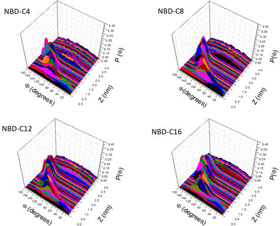 The orientation of the NBD group when located at different depths in the POPC bilayer is shown in Figure 4. When in bulk water (z ≥ 3 nm for NBD-C4) no preferential orientation is observed. When the amphiphile inserts its alkyl chain in the lipid bilayer, a strong preference for orientations close to 180° is observed. In this orientation the NO2 group is pointing towards the aqueous medium, allowing the alkyl chain to orient parallel to the lipids in the bilayer. The NBD group has a large dipole moment (9 D), oriented with the negative pole in the NO2 group and the positive pole in the alkyl chain [96]. Thus, when inserted in the lipid bilayer at the equilibrium position, the dipole moment of the NBD amphiphiles is oriented parallel to the dipole potential of the membrane, in a repulsive interaction. This orientation is attained to allow the alignment of the amphiphilic moment of NBD-Cn and that of the lipids, with the alkyl chain of NBD-Cn inserted deeper and aligned with the lipid acyl chains. Accordingly, the angle distribution is broader for NBD-C4 (with a small alkyl chain) and is more accentuated for the amphiphiles with higher amphiphilic moments. As the NBD group is moved from the equilibrium position towards the center of the membrane, a shift is observed towards the attractive antiparallel orientation between the amphiphile dipole moment and the membrane dipole potential. However, exactly in the center of the bilayers, the orientation of the NBD group is mostly random. This shows that at this position, the orientation of the alkyl group parallel to the bilayer surface (not inserting in any of the leaflets, Figure S7 right plots) is the major energetic requirement.
