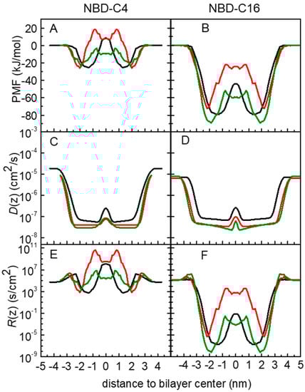 Free energy (A,B), local diffusion coefficient (C,D) and local resistance (E,F) profiles for the amphiphiles NBD-C4 (A,C,E) and NBD-C16 (B,D,F) in POPC (black), POPC:Chol (1:1) (red) and SpM:Chol (6:4) (green) bilayers.