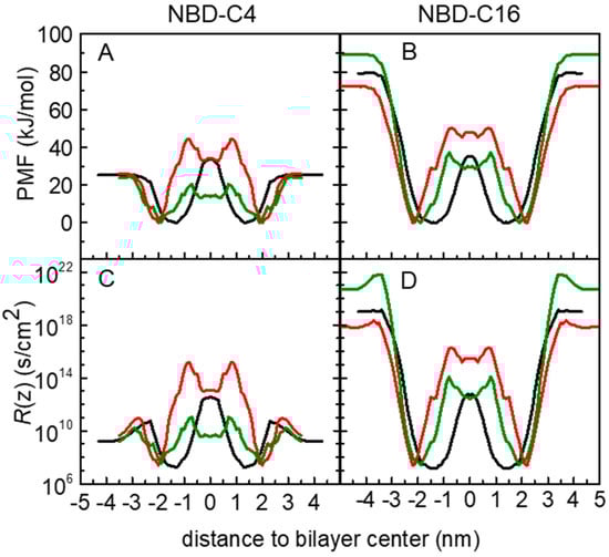 Free energy (A,B), and local resistance (C,D) profiles for the amphiphiles NBD-C4 (A,C) and NBD-C16 (B,D) in POPC (black), POPC:Chol (1:1) (red) and SpM:Chol (6:4) (green) bilayers, taking the equilibrium position of the amphiphiles as reference for the PMF profiles.
