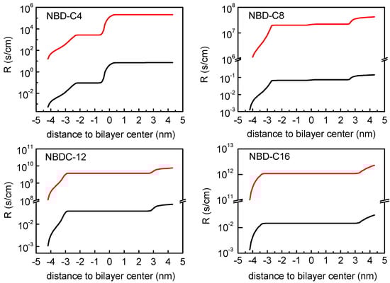 The membrane regions that contribute the most to the resistance to permeation may be clearly evaluated plotting the integration of the resistances across the lipid bilayers as shown in Figure 7. Three main regions contributing to this resistance are identified: the entrance to the membrane, the transition through the bilayer midplane, and finally the desorption from the bilayer. The relative contribution of each region depends on the amphiphile. For the cases where the energy barrier for the translocation is higher than that for desorption, such as shown for NBD-C4, the center of the bilayer is the region that contributes the most to the overall resistance. For the other cases (notably for the amphiphiles with longer alkyl chains), the translocation energy barrier is lower than that for desorption, and the overall resistance is determined only by the water/lipid interfaces. This is in agreement with the observation that desorption from the membrane is the rate-limiting step in the case of the NBD amphiphiles with long alkyl chains [11]. The integration of the resistance corresponding to the PMF profiles with the energy reference at the equilibrium position results in higher resistance values (red curves in Figure 7), with the same shape as that obtained with the reference in water (black curves in Figure 7), which translates into lower permeability coefficients.