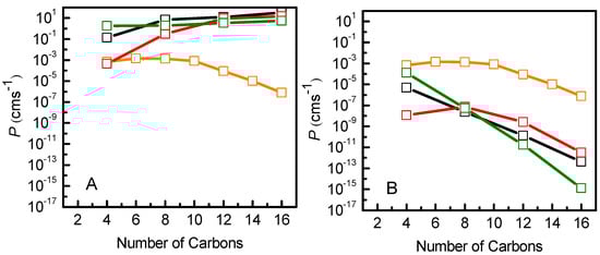Comparison of permeability coefficients of NBD-Cn, calculated from MD simulations using the ISDM, for POPC (black), POPC:Chol (1:1) (red) and SpM:Chol (6:4) (green), and calculated from the integration of the kinetic rate constants through a cell monolayer mimicked by POPC [11] (orange). The application of the ISDM considers the origin of the PMF profiles in the water (A) or in the energy minimum of the system (B).