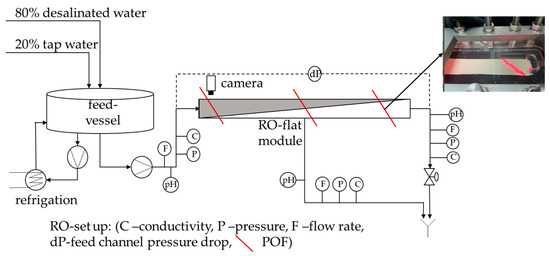 The polymer optical fiber (POF) sensors were tested in the same RO pilot plant as previously described by some of us [13]. The only changes made to the current RO setup were the camera position and composition of the water used for the biofouling experiments. The following Figure 1 shows the RO pilot plant used for the present study: