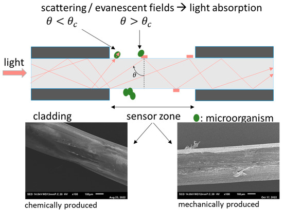 Mode of operation of the fiber-optical sensor. Top: schematic description of the optical fiber with removed fluoropolymer cladding and the two modes of interaction between light and deposits on the surface: scattering and evanescence-based attenuation. Bottom: scanning electron images (SEM) images of the sensor zone. In the left image, the cladding is removed using ethylaceteate, and in the right micrograph by mechanical abrasion.