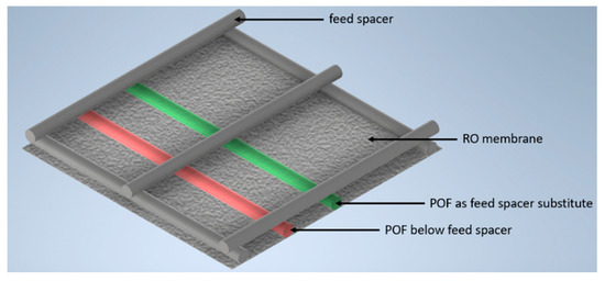 The fibers were installed below the feed spacer or as a spacer substitute. The setup with the incorporated fibers, the feed spacer, and the RO membrane is shown in Figure 3.