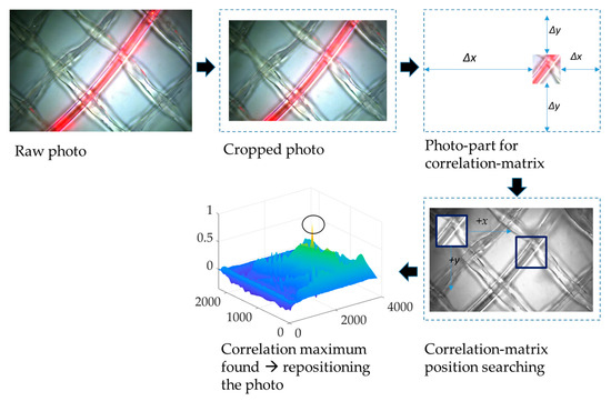 - The images were aligned. The Matlab® function normxcorr2 was used to create a normalized cross-correlation matrix between the selected feature image section and the sensed images of the time series, which were transformed into greyscale images. This function moves the smaller matrix containing the features across the bigger matrix to find the location via the maximum in matching [18]. Next, parameters for further transformation, namely aligning the sensed images around the selected features, had to be extracted using the Matlab® functions find and max.