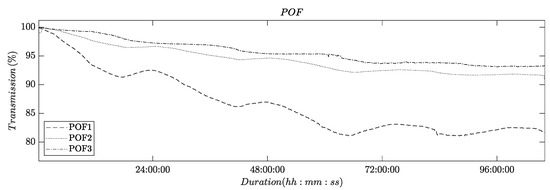 The initial set of experiments aimed to demonstrate the long-term effects of POF transmission. The POFs were integrated into an RO system under normal filtration conditions, without forming deposits on the membrane and spacer surfaces. The RO system operated using a 2 g/L NaCl feed solution over the course of several days, with the retentate and permeate flowing back into the feed vessel. Figure 5 illustrates the time series of transmission obtained from these experiments, which were conducted in triplicate.