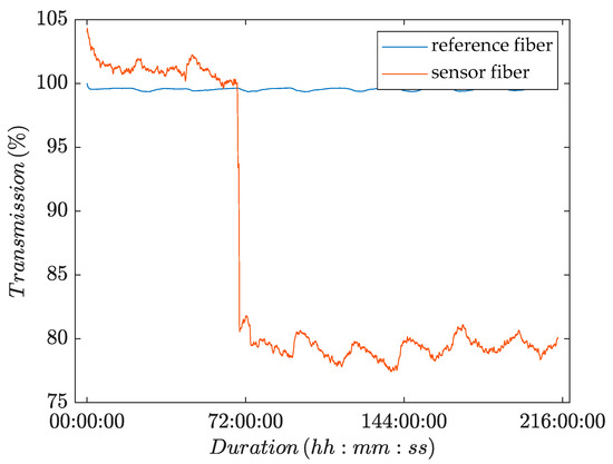 Prior to the experiments, the POF sensors were conditioned for at least 96 h using a NaCl solution to avoid any effects on the intensity of transmitted light due to water adsorption or mechanically induced transmission loss. The experiment was executed three times. Because the results of all experiments were very similar (see Figure 10), we will focus on discussing the findings from one experiment.