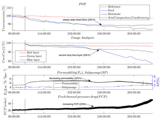 Figure 7 shows the time series of the measured online parameters. The vertical dotted line marks the end of the conditioning and compaction phase; this also marks the moment the dosing of nutrients was started and the switch in feed composition to a mixture of tap water and desalinated water. Figure 7 displays the recorded time series from 96 h onwards, at which point the POF transmission reached a steady-state level (see Section 3.1).