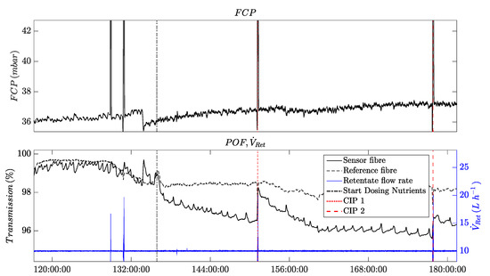 The light intensity transmitted by the POFs on the feed and the retentate side immediately decreased after the end of compaction and with the onset of dosing nutrients to the changed feed solution. The POF’s light transmission on the feed side of the membrane module stopped decreasing and reached a steady-state level from 240 h onwards while the retentate fiber’s light transmission continued to decrease.