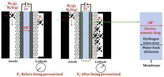 Physical methods of compressing hydrogen include the use of compressed gas and liquid hydrogen storage [13]. Liquid hydrogen storage can achieve high volumetric densities; however, it is preferred only for special applications because of cost and storage design issues [14]. Therefore, compressed gas storage is the most commonly used storage method [15]. Mechanical and non-mechanical compression methods are used to compress gaseous hydrogen [16] such as hydrogen-embrittled mechanical compressors [17]. In addition, mechanical compressors have many moving parts and tend to leak hydrogen through seals. Hence, electrochemical hydrogen compressors (EHCs) can be used as an alternative [13]. EHCs operate as shown in Figure 1. According to Equation (1), hydrogen is supplied to the anode and oxidized in the catalyst layer. Subsequently, protons move to the cathode through a proton exchange membrane (PEM), and electrons move through an external circuit. According to Equation (2), the electrons and protons are combined and reduced to hydrogen at the cathode. This compression is performed under high pressure at the cathode to improve the specific volumetric energy density of hydrogen. The high-pressure hydrogen compressed at the cathode crosses over to the low-pressure anode, and back diffusion of water occurs due to the concentration difference.