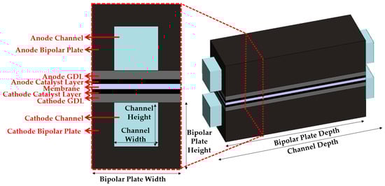 A numerical analysis was performed to observe the area-specific resistance of an EHC. Figure 2 shows the EHC single-channel model using SOLIDWORKS 2020. A 3D single channel consists of bipolar plates, gas channels, GDLs, CLs, and membranes. Table 1 lists the geometric parameters of the single-channel EHC model.