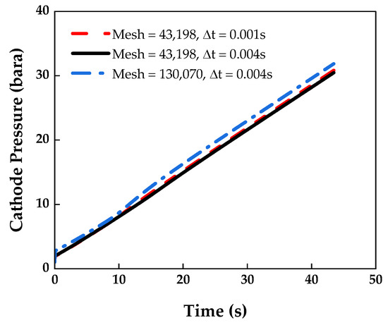 Figure 3 shows the results of the mesh and time step independence tests for the cathode pressure over time. The coarse grid of (43,198 cells) and time step of (0.001 s) differed by approximately 1% from the coarse grid of (43,198 cells) and time step of (0.004 s). In addition, there was a 5% difference in the coarse grid of (43,198 cells) and time step of (0.004 s) from the fine grid of (130,070 cells) and time step of (0.004 s). Therefore, the simulation was conducted by selecting the course grid of (43,198 cells) and time step of (0.004 s) to shorten the calculation time.