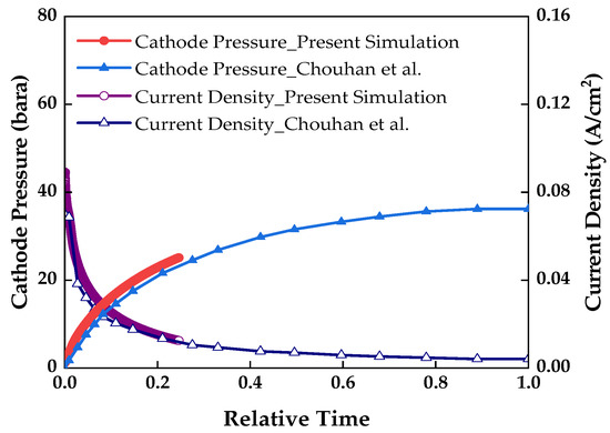 To verify the reliability of the 3D unsteady-state model, we compared the results of the present simulation with the experimental results of Chouhan et al. [39]. Figure 4 shows the results of the cathode pressure and current density over time when the voltage was 0.05 V; the results are based on the reference model. Due to the difference in the cathode volume, the simulation results showed a faster convergence time for the cathode pressure and current density than that in the results of Chouhan et al. [39]. Therefore, the results are expressed in relative time, which was obtained by dividing the time taken for the cathode pressure and current density to converge on the x-axis. When compared with the results of Chouhan et al., the cathode pressure matched well with a deviation 1.4%, and the validity of the simulation model was verified [39].