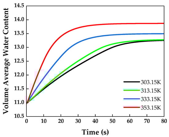 To analyze the membrane water content accumulation according to the temperature, numerical analysis was performed under the following operating conditions: a relative humidity of 100%, a polymer electrolyte membrane thickness of 125 μm, and a GDL porosity of 0.4. Figure 5 shows the volume-averaged water content across the membrane over time, measured at various temperatures, which increased rapidly as the operating temperature increased. This is because the amount of saturated water vapor supplied increases with the temperature. Therefore, the volume-averaged water content was the highest at 353.15 K.