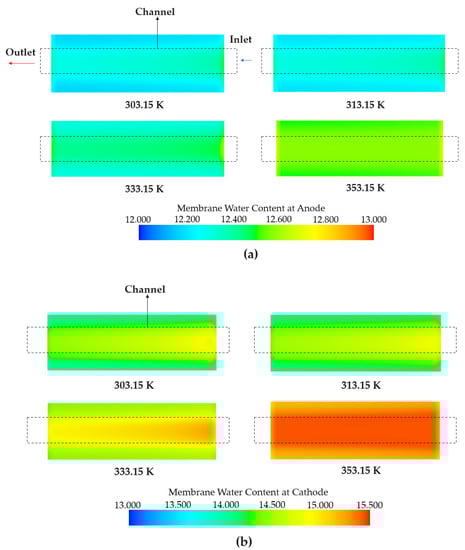 The water content is a nonlinear function of the water activity [40]. The water activity is expressed as a function of the water saturation partial pressure and water partial pressure calculated from the temperature [41]. As the water content is a nonlinear function of the temperature, 303.15 K and 313.15 K converged to similar values. As shown in Figure 6, the water content of the anode and cathode had similar values at 303.15 K and 313.15 K. In addition, higher temperatures contribute to a higher water content owing to the increased water vapor supply.
