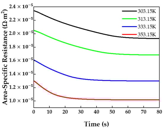 As shown in Figure 7, when the time was at 0 s, the area-specific resistance varied depending on the temperature, while the volume-averaged water content showed no dependence on the temperature. As the ionic conductivity includes a temperature term, the area-specific resistance varied largely with the temperature. Thus, a difference of about 47.2% was observed between 303.15 K and 353.15 K in terms of the area-specific resistance. Consequently, as the operating temperature increased, the area-specific resistance decreased.