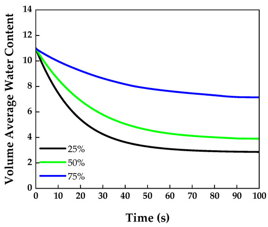 A temperature of 333.15 K, a polymer electrolyte membrane thickness of 125 μm, and a GDL porosity of 0.4 were selected to compare the water content results depending on the relative humidity. Figure 8 shows the water content over time for each relative humidity level. As a low relative humidity leads to a low partial pressure of water vapor, the water content dropped significantly in the case of 25% relative humidity compared to that of the other cases.