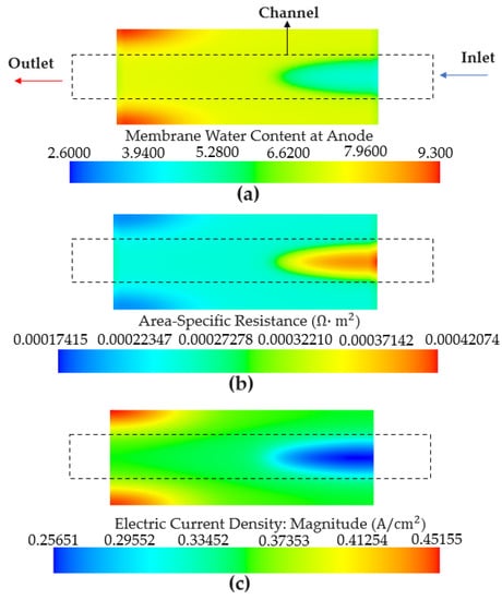 Figure 9a shows the water content of the membrane with a relative humidity of 75%. The inlet region exhibited a drier state compared with the other regions. As mentioned earlier, the membrane was properly hydrated with a volume-averaged water content of 11 in the initial stage. Generally, when dry water vapor is supplied to a membrane that is already adequately hydrated, the inlet region becomes drier compared to the other regions. Due to the poor diffusion of the dry water vapor towards the edge of the outlet region, the water content in that region remained higher compared to the other regions. Hence, the area-specific resistance shown in Figure 9b indicates a high value in the inlet region and a low value at the edge of the outlet region. Additionally, Figure 9c further illustrates that the dried inlet region had a low current density, whereas a high-current-density distribution was observed at the edge of the outlet region.