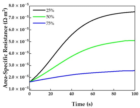 The higher the relative humidity, the higher the induced partial pressure. As shown in Figure 10, the increase in the area-specific resistance was slower at a high relative humidity than at a lower RH. Therefore, a high relative humidity should be selected to sufficiently hydrate the membrane.