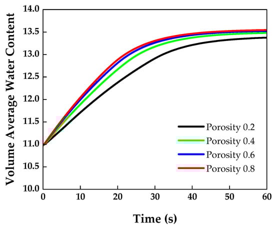 The GDL undergoes changes in the conduction of heat, electrical, water, and gas transport, depending on the material properties [43]. Figure 11 shows the volume-averaged water content at various GDL porosities.