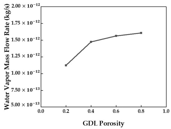 Water vapor mass flow rate depending on the GDL porosity measured at the channel–GDL interface.