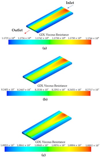 The lower the GDL porosity, the lower the volume-averaged water content measured in the membrane. When the GDL porosity was low, the amount of water vapor passing through the GDL area decreased. Figure 12 shows the water vapor mass flow rate with respect to the GDL porosity. The water vapor mass flow rates under GDL porosities of 0.4, 0.6, and 0.8 were similar. As shown in Figure 13, the highest viscous resistance was obtained for a GDL porosity of 0.2. Therefore, the lowest water vapor mass flow rate was observed. In addition, as the velocity term of the viscous resistance is included in Equation (11), a higher viscous resistance was obtained at the inlet where a high flow rate was observed. The viscous resistance then gradually decreased towards the outlet.