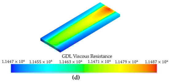Viscous resistance measured in the GDL depending on the GDL porosity at 60 s. (a) Porosity of 0.2. (b) Porosity of 0.4. (c) Porosity of 0.6. (d) Porosity of 0.8.