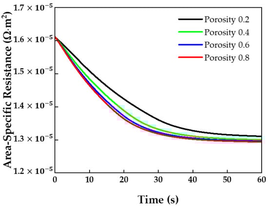 Figure 14 shows the results of the measurement of the area-specific resistance over time using various GDL porosities. The higher the GDL porosity, the lower the area-specific resistance. A high GDL porosity can smoothly supply water vapor and hydrogen to the membrane and reduce mass transfer resistance [44]. As the current increases, the mass transfer resistance becomes dominant [45]. Therefore, to reduce the area-specific resistance and mass transfer resistance when operating at a high current, it is optimal to use a GDL porosity of 0.4 to 0.8.