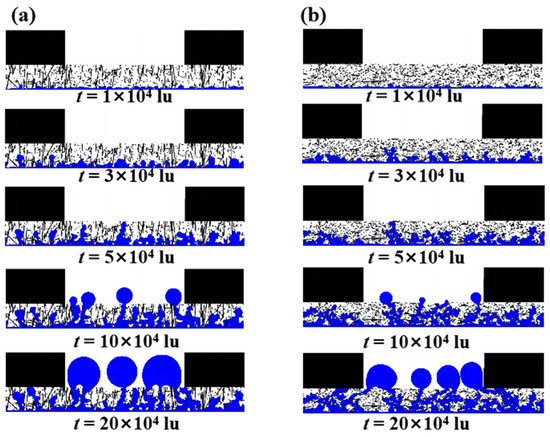 Figure 3 illustrates the evolution of the liquid water distribution within the uncompressed GDL for β = 0.1, 1, 10, and 100 with time. Black in Figure 3 represents the solid part (carbon fibers and ribs), and blue represents the liquid water intruding into the GDL from the catalyst layer. At t = 1 × 104 lu, which is the initial stage of liquid water transport, liquid water was evenly distributed at the bottom of the GDL and formed a number of bumps. As time passed, the liquid water gradually accumulated within the GDL, and at t = 3 × 104 lu, it had flowed into the middle region of the GDLs. According to the Young–Laplace law, the capillary pressure can be calculated as follows:
