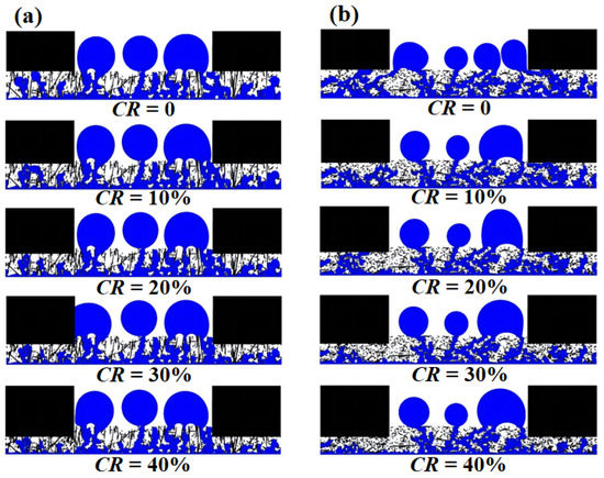 Figure 6 shows the distribution of liquid water at steady state for GDLs with β = 0.1, 1, 10, and 100 at compression ratios of 0, 10%, 20% 30%, and 40%. For the uncompressed GDLs, liquid water within the GDLs with β = 1, 10, and 100 breakthrough to the GC all presented a liquid film covering the GDL. The significant effect of fiber orientation on liquid water transport was revealed by the fact that liquid water within the sub-rib GDL will flow laterally when contacted by carbon fibers oriented parallel to the in-plane direction and eventually form a pathway across the sub-rib region and the sub-GC region, such that a pathway breaks through to the GC where a liquid film can easily form. It was reported by Jeon et al. [35] that the liquid film is difficult to remove during fuel cell operation and can cover the pathway for reactive gases diffusion from GC to GDL, which is a negative effect on the operation of the fuel cell system. It can be seen that even with 10% compression, the liquid film in the GC in Figure 6b–d disappeared because the interface between the GDL under the GC and the GDL under the rib became more complex due to compression, and the lateral flow of liquid water under the rib was inhibited. As the compression ratio increased, the deformation of the microstructure of the GDL under the rib became more drastic, and the pore size became smaller. Thus, as the compression ratio increased to 20%, 30%, and 40%, the pore size was reduced to the point where it was difficult to support liquid water transport, and the content of liquid water under the rib gradually decreased, which was observed within all four GDLs. Conversely, compression had little effect on the liquid water within the gas diffusion layer under the GC, either on the main circulation path of the liquid water or on the number of droplets within the GC.