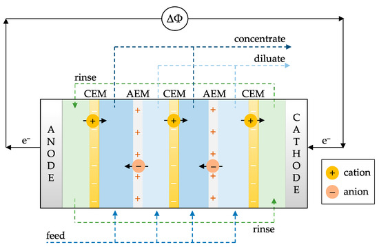 Electrodialysis is an ion-exchange membrane (IEM) process for ion separation or accumulation by applying an electric current across the cell [14]. In an electrodialysis process, ions transport from one compartment to another through IEMs under the applied potential as a driving force. Figure 1 illustrates a typical electrodialysis cell consisting of several cell pairs (an anion exchange membrane (AEM)), a dilute compartment, a CEM, and a concentrate compartment) sandwiched between an anode and a cathode. Since electrochemical reactions take place at the electrodes that deplete or create ions, causing a charge imbalance and the formation of an electric field across the cell. As a result, cations migrate toward the cathode, passing through the CEM, and reciprocally, anions migrate toward the anode through the AEM. Consequently, each second compartment is desalinated while ions accumulate in each alternate compartment.