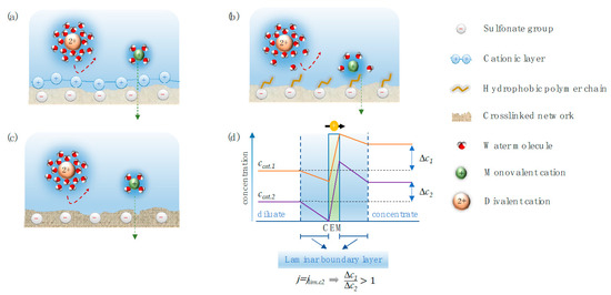Different parameters of ion selectivity: (a) electrostatic barrier effect—imparting a cationic layer on CEM establishes an electrostatic repulsion of the cation with higher valency compared to the monovalent cation; (b) dielectric effect—increasing the hydrophobicity of the membrane restricts the passage of cations with higher hydration energy compared to ions with lower hydration energy; (c) sieving—introducing a crosslinking agent creates a compact network reduces the ingress of the larger cations, while smaller cations can permeate through the membrane; and (d) boundary layer separation—ion depletion within the boundary layer succeeds more or less fast for competing counter-ions based on their concentration, ion characteristics, and the applied current.