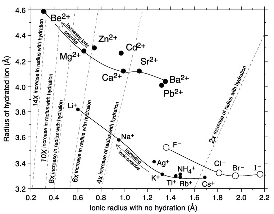The inverse relationship between radius with hydration and non-hydration. Ions with smaller sizes tend to become more hydrated due to having a higher charge density. The figure is reprinted with permission from “Railsback (15 May 2020) as accessed at http://railsback.org/FundamentalsIndex.html (accessed on 25 May 2023) ”, where Railsback (2020) is “Railsback, L.B., 2020, Some Fundamentals of Mineralogy and Geochemistry. http://railsback.org/FundamentalsIndex.html (accessed on 25 May 2023) ” [29].